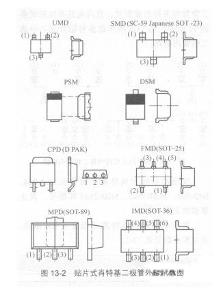 圖13-2是貼片式肖特基二極管外形示意圖,貼片式肖特基二極管有單管型、雙管型和三管型多種。